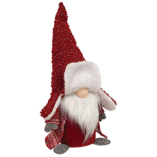 The Fuzzy Red Gnome with Sweater Jacket brings a whimsical touch to festive seasonal decor. The gnome features a fluffy white beard and beige button nose. A textured red knit cap adorns the gnome’s head and he wears a red and gray printed sweater jacket. The gnome is freestanding for stable display on a flat surface. Measures 14” high by 7” wide.
