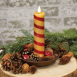 Thick Antiqued Candy Cane LED Taper is an electric taper candle with rustic seasonal design. The candle features an artificial flame with a realistic flickering effect and is adorned with red and beige candy cane stripes. The stripes feature a rustic look and an allover sprinkling of silver glitter. A button on the bottom allows for easy on-and-off. The candle requires 1 AAA battery, which is not included. Measures 8" high by 1.75" in diameter. Holder sold separately.